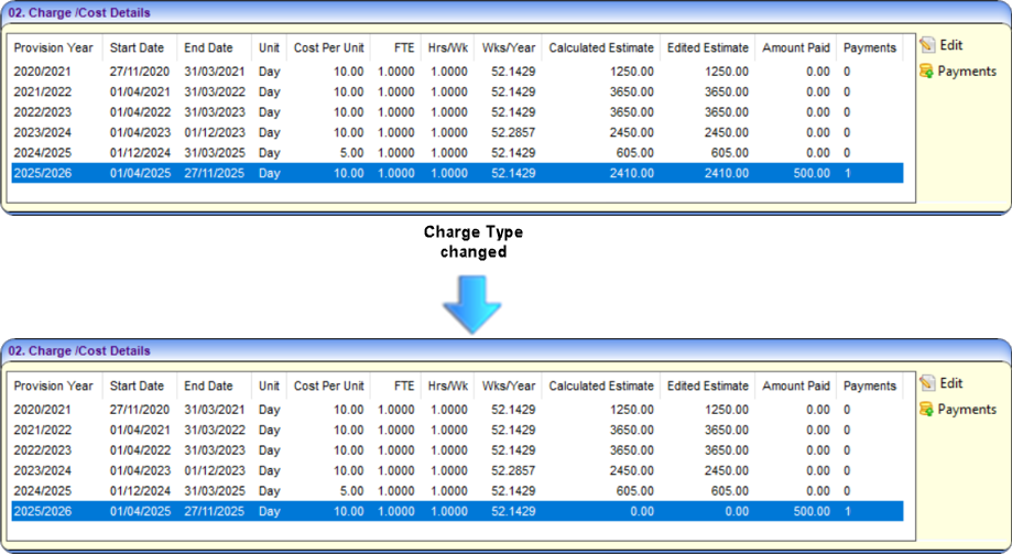 Currently this means Charge/Cost transaction data is deleted. Now instead of deleting the affected record, Calculated Estimate and Edited Estimate values are set to Zero. The transaction data for these Charges/Costs remains unchanged.