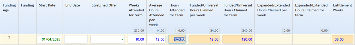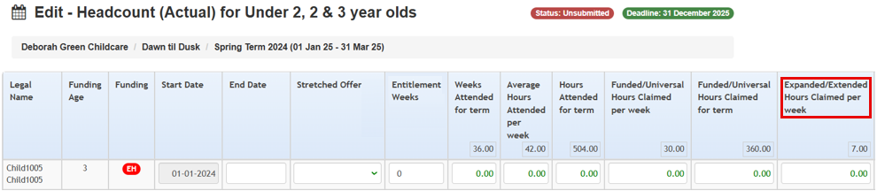 Enables providers to record expanded funding to eligible under 3 year old children. The maximum number of expanded hours per week from September 2025 is 30. Defined within the payment limits and payment parameters for each age and provider.