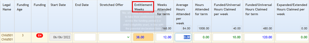 For a child in the Spring term:- Defaults to 38 weeks when entering hours greater than 0 for the following (per week or term):