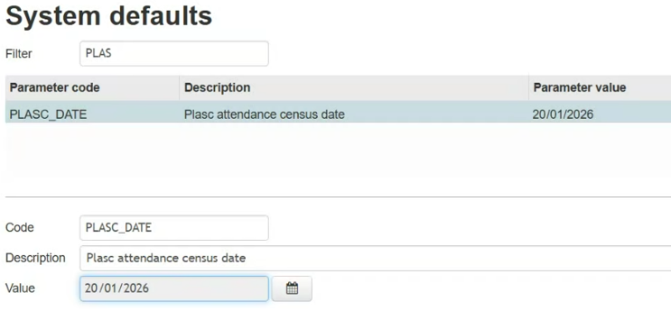 A new System default has been added for the PLASC Census Date. LAs can now update the census date as required. The date populates the <ReferenceDate> tag within the ATS and ATP files.